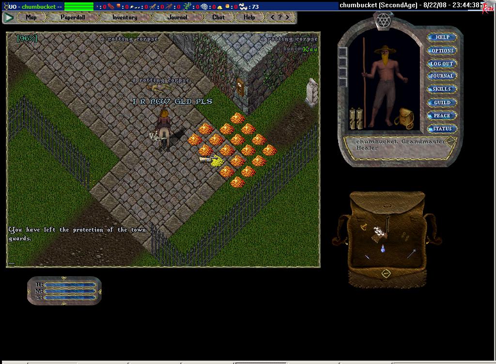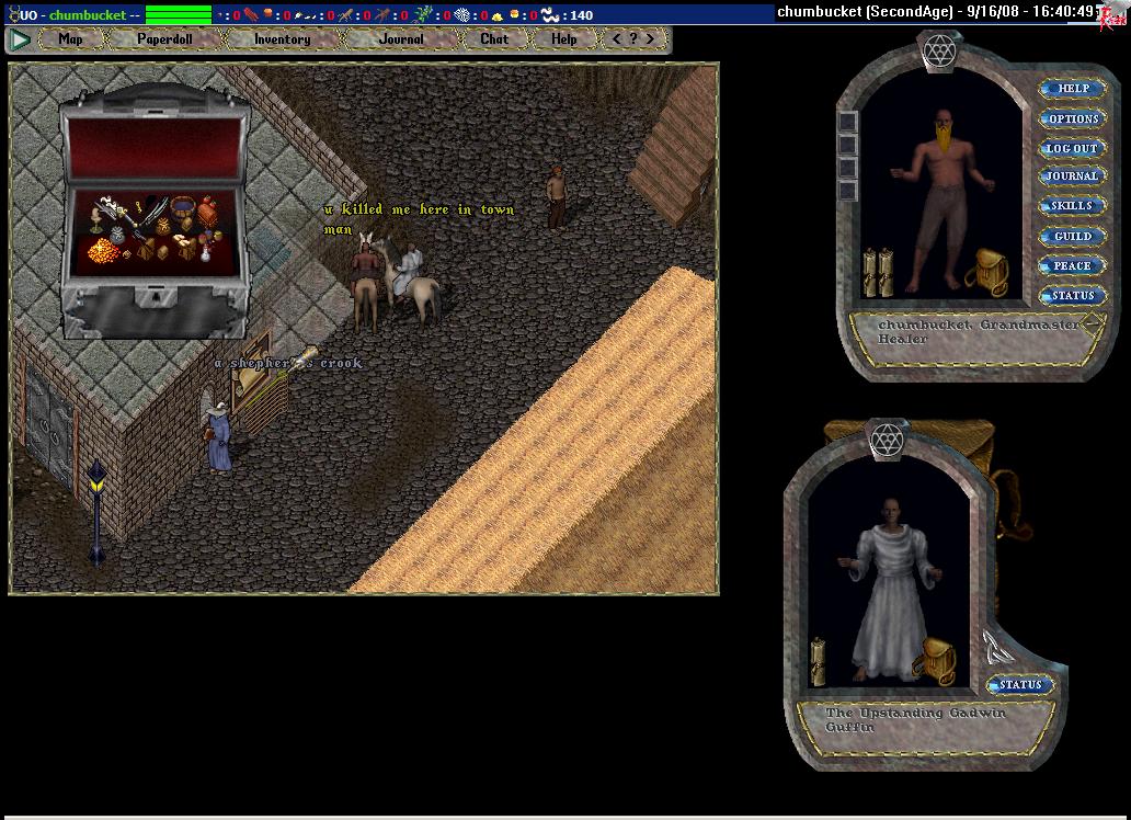 I've had a lot of fun here. This is a really great shard. Derrick and his team do an incredible job, and there is a nice community of players. When I first came here, I had two plans: (i) to make a red pk that mostly focused on killing (but not looting) the helpless and (ii) to make two thieves (one stealth, one mace). I never really got into the first due to my lack of PvP skills and the inevitable giant stat loss that would come down on me when I faltered, but I obviously ran pretty hard with the second. And it reminded me why the thief is by far the most fun template in UO: Being a jerk can be fun if you do it right. But, even so, acting as I do in game is normally against my nature. I have a natural dislike of other UO players and that helped. But here it was particularly hard. I maintained a very small do-not-steal-from list, but I liked most of the people I stole from as well. Even Hemperor.