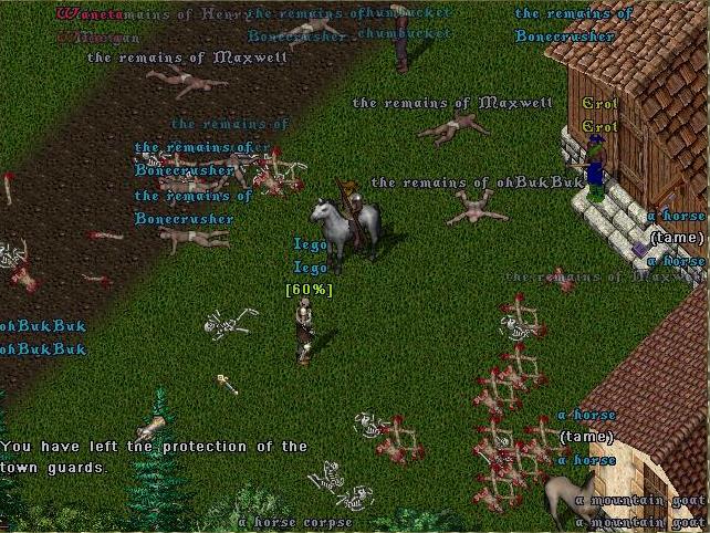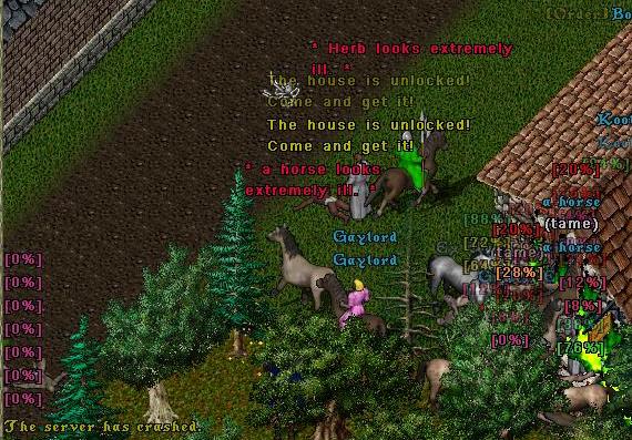 Most people believed I would simply drop the house. But I decided on forcing people to come in, that way the 150 trapped boxes inside would have to be opened on the spot and there would be a rush to get in through the door. I keep my macer inside to make sure the horses of the fallen don't slow things down too much. [They did regardless!] There must have been twenty-five or thirty people trying to get in. Some kid soul decided it would be nice to cast poison field on the steps. God bless you. Derrick stood by silently watching from the inside.