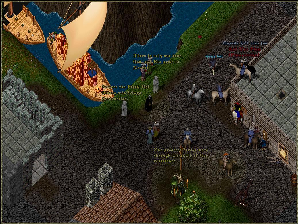 “Beware the coming of Lord Aldaen the Black!” Silas continued to call out across the bank at West Britain, home of the scum of the country. The area was full of thieves who snooped your pouches and stole from you the instant you turned your head. The fresh corpse of a theif lay on the ground, newly executed by Lord British’s guards for thieving. For every one that got caught though, twenty ran off unchallenged.
