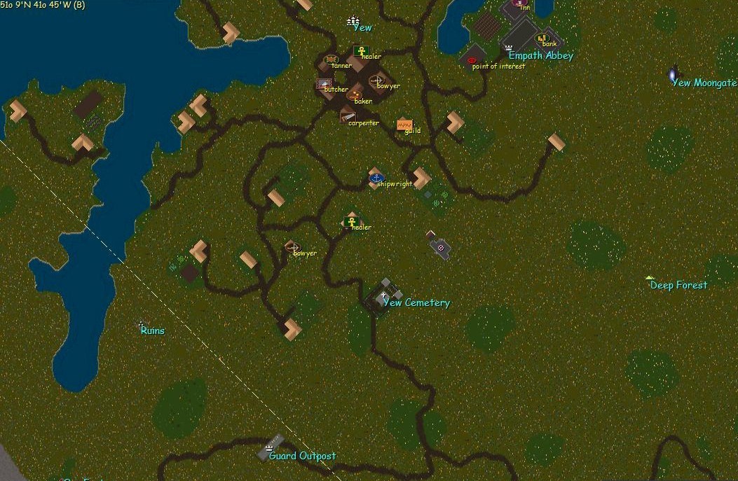 Tower is located SSE of the bank, near guard zone, healer, map seller, bowyer, cemetery, and the rest of town.....basically no spawn, really nice spot.