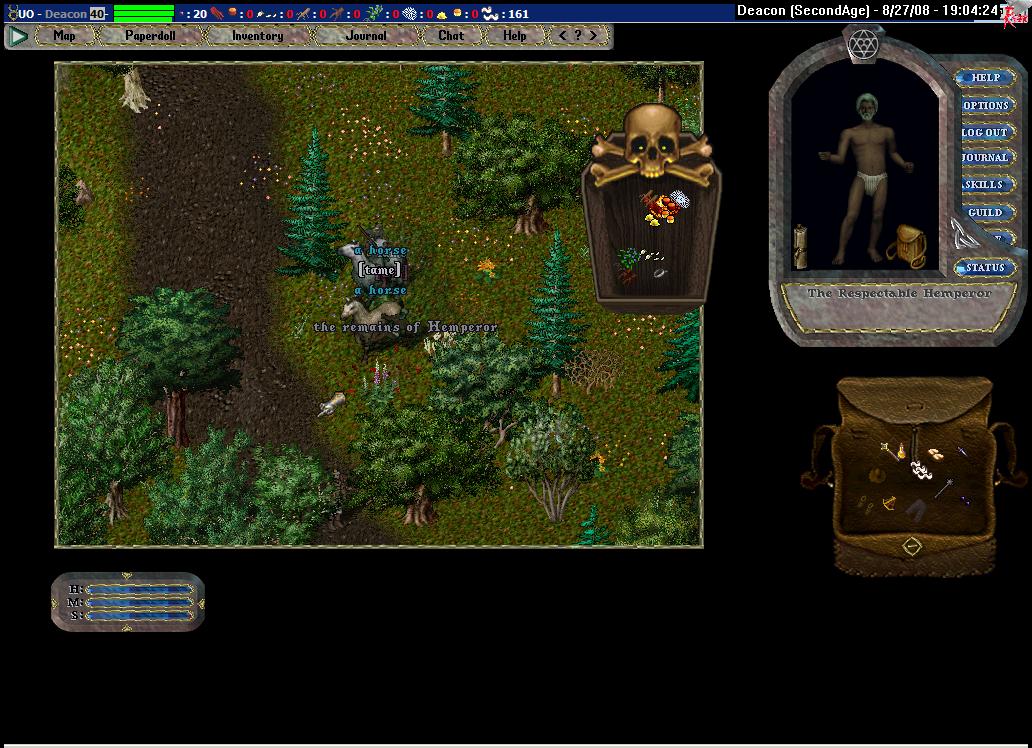I follow him to the stables and at an opportune moment make my move. His bag is nearly empty: bone armor, bandages and a kryss. Some duel this is going to be. I take the kryss, but he doesn't seem to notice. He asks me to gate to the duel location, but I, having no magery, suggest we just walk out of the guard zone. We arrive a large clearing and I dismount. He equips a newbie dagger. Yes, a newbie dagger. I'm somewhat confused, but he attacks me anyways. I remount before the first blows are even traded.