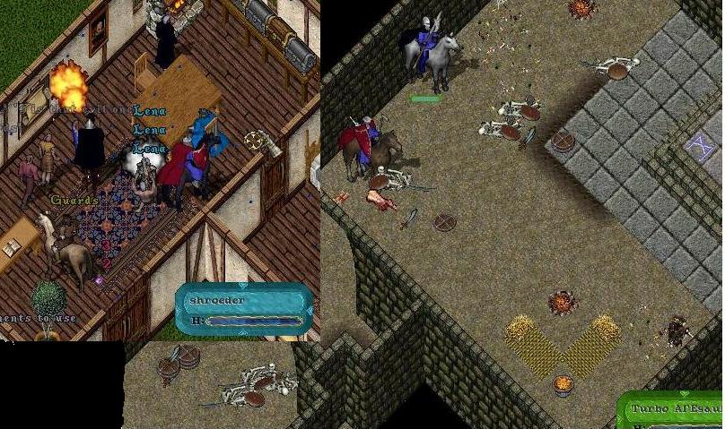 Tubro arrives and as we patrol all seems well in the city. We decide to work on fame and karma. Turbo has heard tales of despicable creatures that dwell in crypts in far off lands. In IRC Shroeder had been asking about buying explo pots earlier in the day. As I am putting on some adeventurer armor Shroeder does a failed explo pot attempt on us with npc bought ones. We loot 15 or so unused ones from his corpse and we head out to serve Justice to the undead!