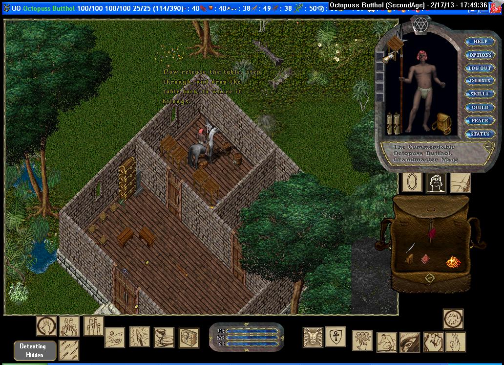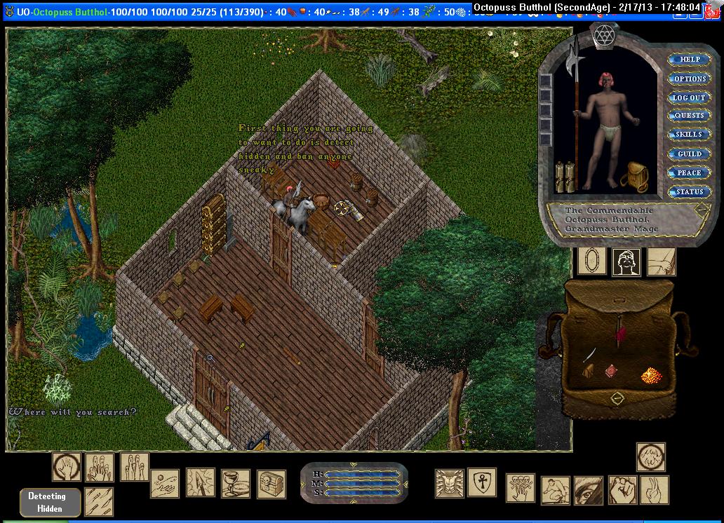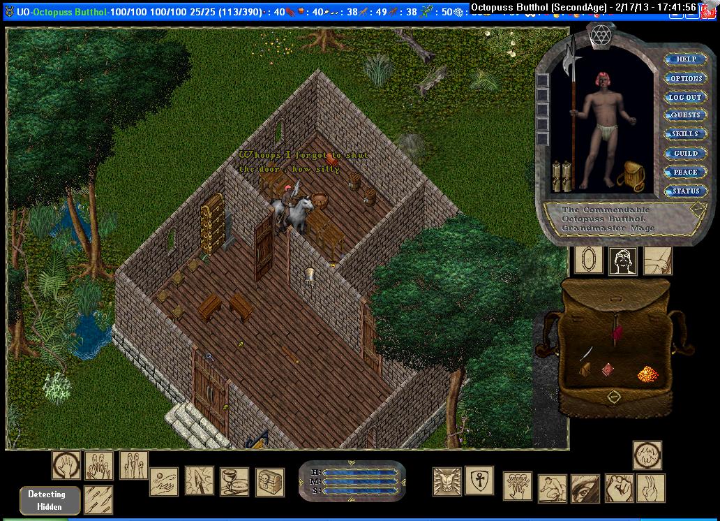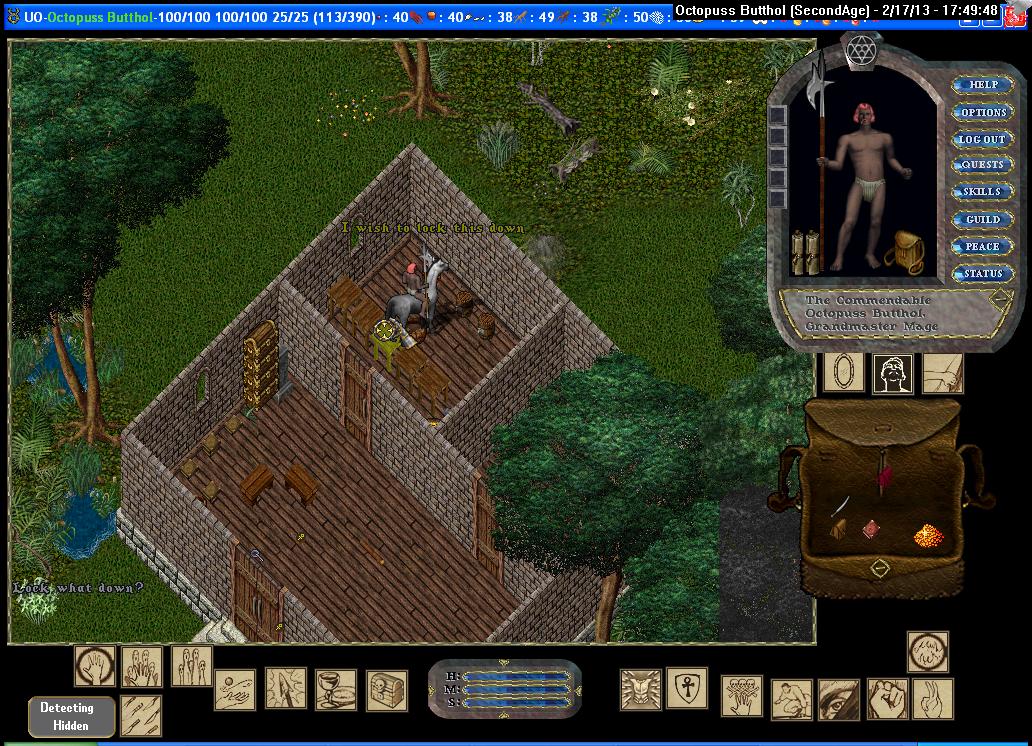 Lastly, we have the three "fortress" homes. Despite their names, they have recently become the least safe homes in Brittania. Due to an era-accurate "bug", players can target spells on the ground inside these houses. (This is accomplished via either a circle of transparency in the Options, or a "relative target" in Razor). Paradoxically, as the player backs away from a house, they can target spots under the foundation further and further towards the inside of the home. What this means is that, assuming courtyards are compromised, there are no safe places from Meteor Swarm within these houses! In some instances, the geography surrounding one of these houses would prevent a player from backing away far enough to see deep inside, and so some tiles may be safe.