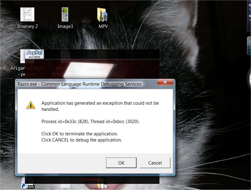 When I load razor and click ok, the client begins to load then freezes on a gray screen and shows the following errors. I thought that maybe it was the full screen option but looks to be something else. Any Ideas? I did run the patch, but does this show 5.0.8.4? and not 5.0.8.3?