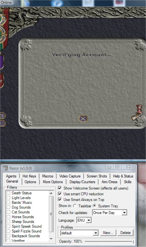 I just prviously down loaded everything i needed to play, uo t2a with 5.0.8.3 patch , razor and .net framework 1.1 and i get stranded at the verifying account screen when i log on currently using windows xp, running razor as admin, the only thing i can think is im trying to connect at 3:00 am central standard time usa and the server is in downtime mode?