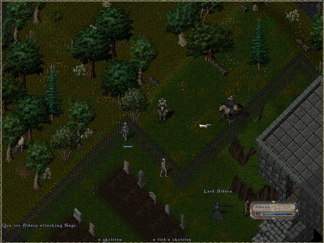 “It was near Cove. I went to help with the Orcs. They chased me off toward the graveyard. I heard a horrible laughter, and when I got to the gates there were skeletons and zombies everywhere. I saw a man in a dark robe with a black staff. He said ‘Despair… I am Aldaen!’ His voice echoed through the woods. He killed my mount from under me and laughed. I only made it away because he started attacking animals and trolls.”