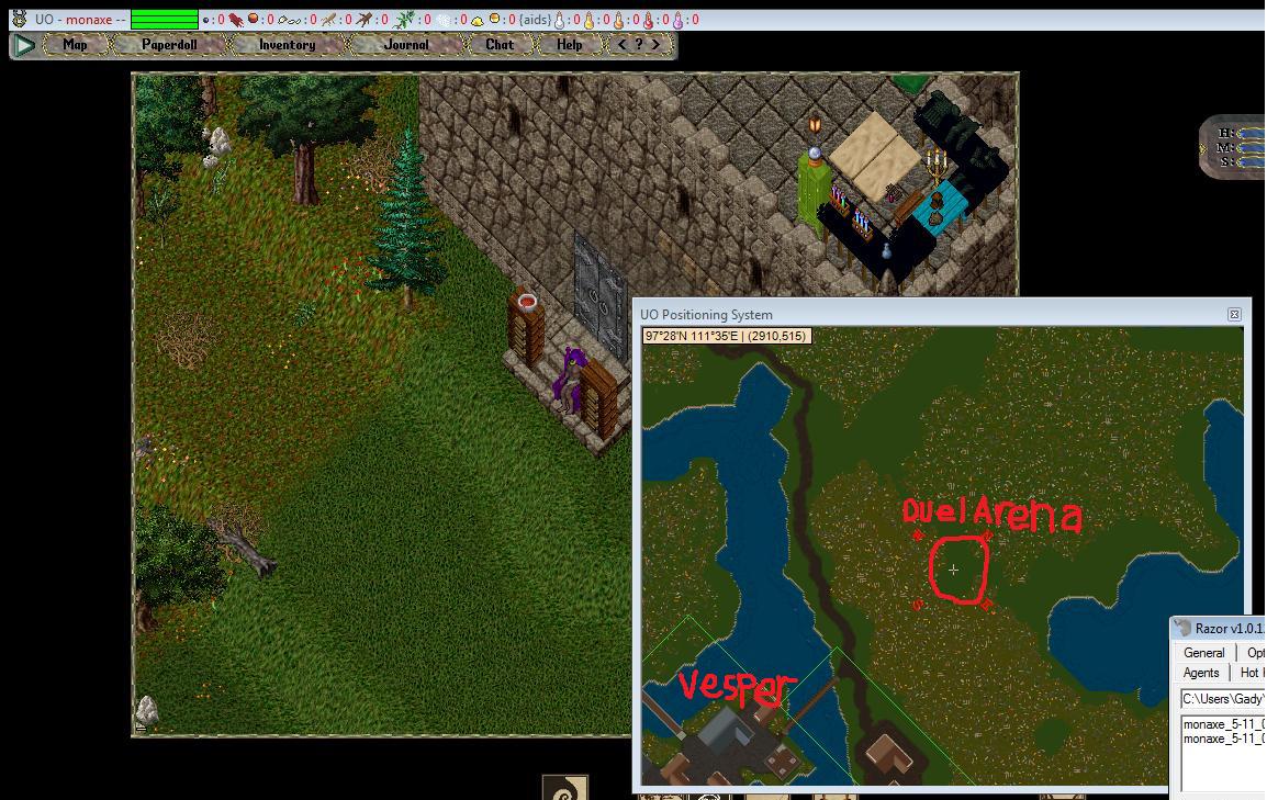 We are trying to get a public arena that is located in great spot. I know most people don't know WCK guild because we just got the guild off the ground. Either way the players in the guild are chill and established, we are not trying to get this duel spot going for the guild or for a guild town we want to use our spot to establish a public arena that is located in a perfect spot behind the vesper strip. We want this to be the spot where people can train pvp as well as have guild battles ( 4v4,5v5, etc...) and pvp tournys. I have seen some really cool arenas around but their locations are sometimes tucked away from new players who don't use irc or fourms to find. What makes this a great is that it is easy enough to run back to town to the bank or to buy some regs and than come back to pvp. everyone has their own playing styles and I think it would be awesome to and the local merchants and craters can come and use the smithy forge and anvil and sell their goods, and even thieves running around would be part of this area. we want this to be a really active zone outside of town that is based for pvp but welcomes merchants to sell either crafted for magic goods, this spot will be out of town so a thief can have victims to pickpocket without worrying about guards.