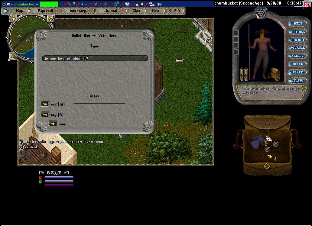 I've had a lot of fun here. This is a really great shard. Derrick and his team do an incredible job, and there is a nice community of players. When I first came here, I had two plans: (i) to make a red pk that mostly focused on killing (but not looting) the helpless and (ii) to make two thieves (one stealth, one mace). I never really got into the first due to my lack of PvP skills and the inevitable giant stat loss that would come down on me when I faltered, but I obviously ran pretty hard with the second. And it reminded me why the thief is by far the most fun template in UO: Being a jerk can be fun if you do it right. But, even so, acting as I do in game is normally against my nature. I have a natural dislike of other UO players and that helped. But here it was particularly hard. I maintained a very small do-not-steal-from list, but I liked most of the people I stole from as well. Even Hemperor.