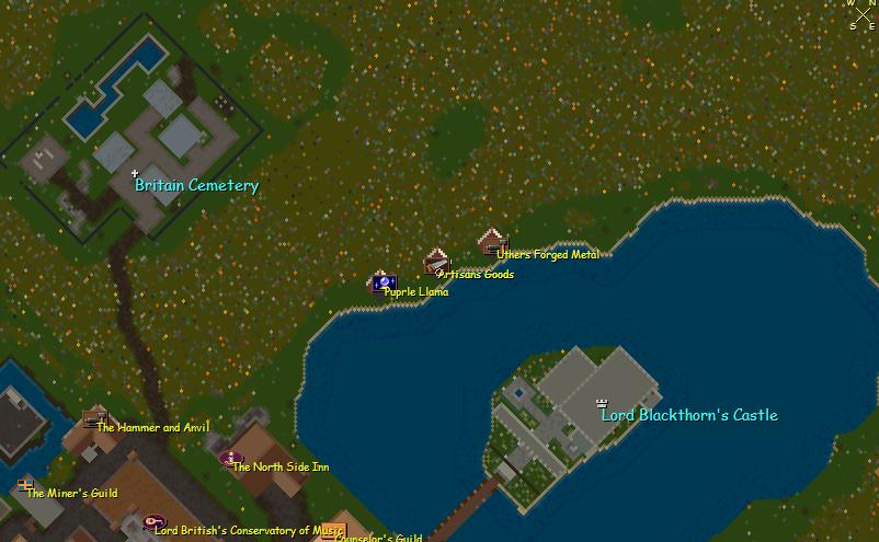 E NE of Britain Graveyard, hugs the western coastline of Lord Blackthorne's moat.