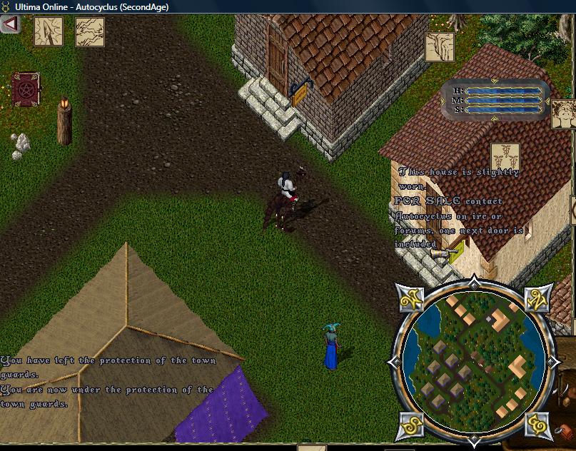 These 2 houses are inside Minoc town on the main road, 1 screen from healers, 5 second run on horse to bank, 10 seconds to minoc gate. These houses are the #1 and #2 nearest the bank. They're in a no guard zone bubble (picture below: blue area signifies no guard zone areas). This would be an awesome spot for a vendor mall especially if you keep them stocked.