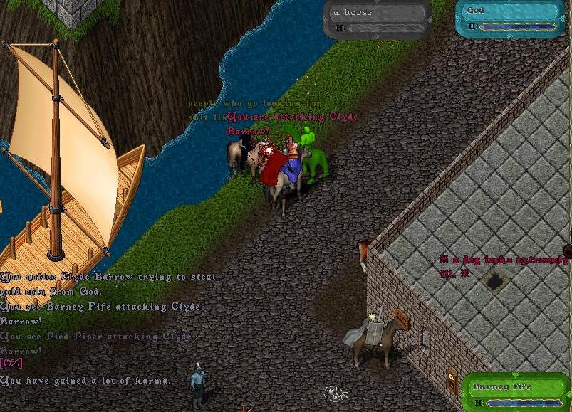 Upon returning to the bank to put up my belongings a criminal named Clyde had contraband on him. A good citizen decided to serve Clyde some vigilante Justice via his horse. I boxed Clyde in and was entertained for a while. The horse did not pity this unsavory smelly human and dug it's hooves deep into the soft flesh of Clyde....over...and over....and over again.
