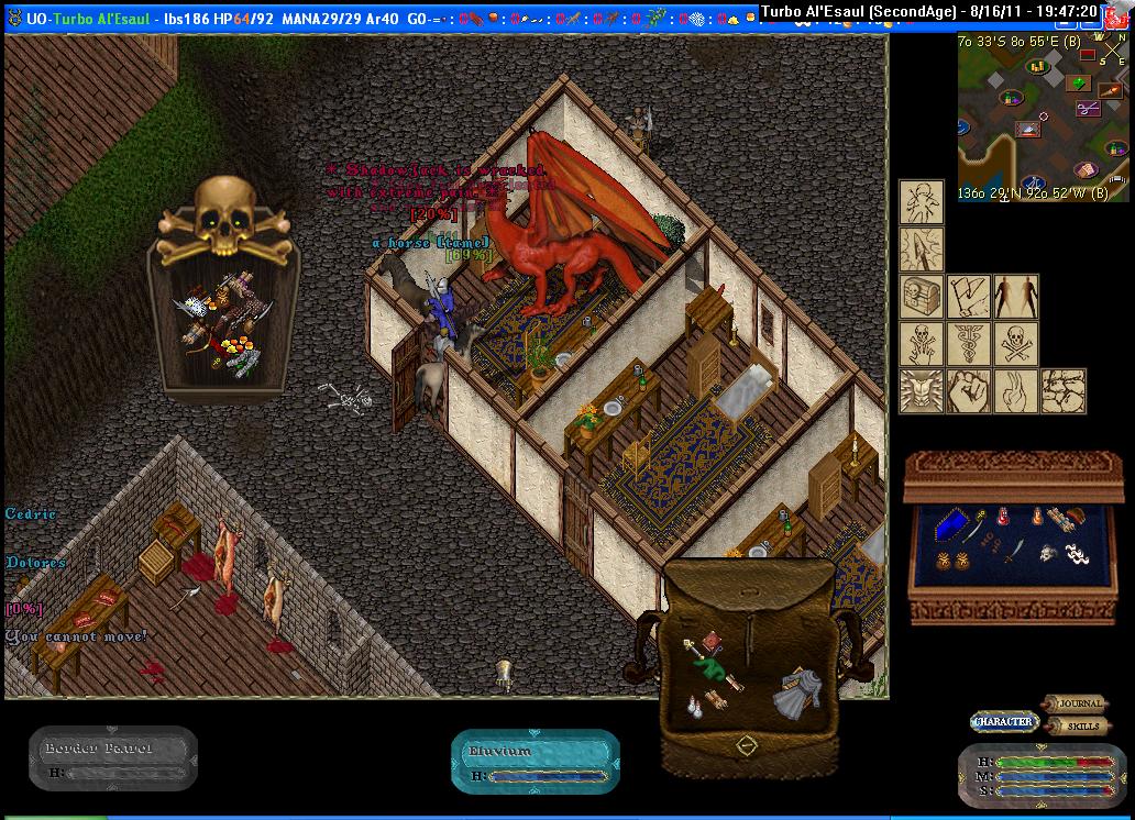 Also, a plug for the citizen Swoleo. Although accused of being "town gank squads" by this citizen, I hold no grudge against him. The job of a law enforcer is difficult and does not always allow the luxury to inquire as to why a person's status is grey. I do appreciate the healthy dose of Karma he gave me, and once I learned that he went gray because he had murdered a cat he had tamed, I returned the evidence I had previously taken from his corpse. Although we might need to watch this guy for possible sociopathic behavior. I hear homicidal maniacs often get their start on mutilating innocent kittens...