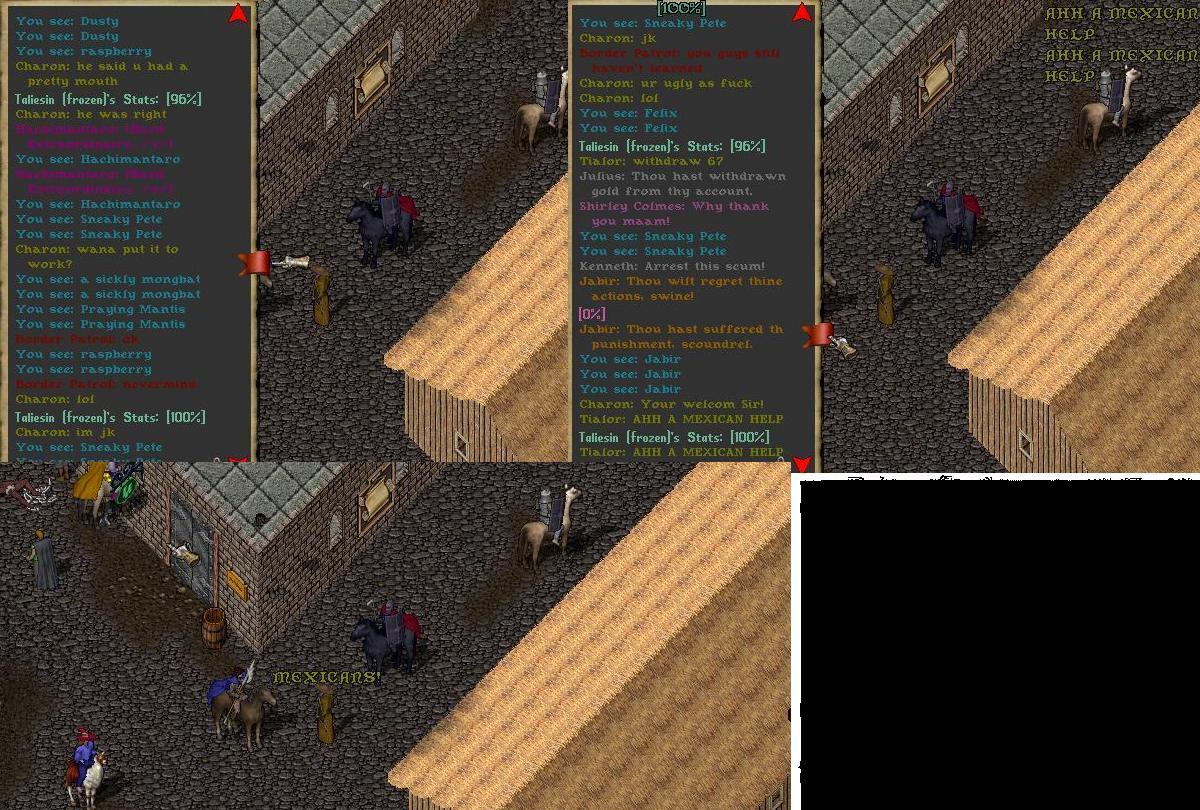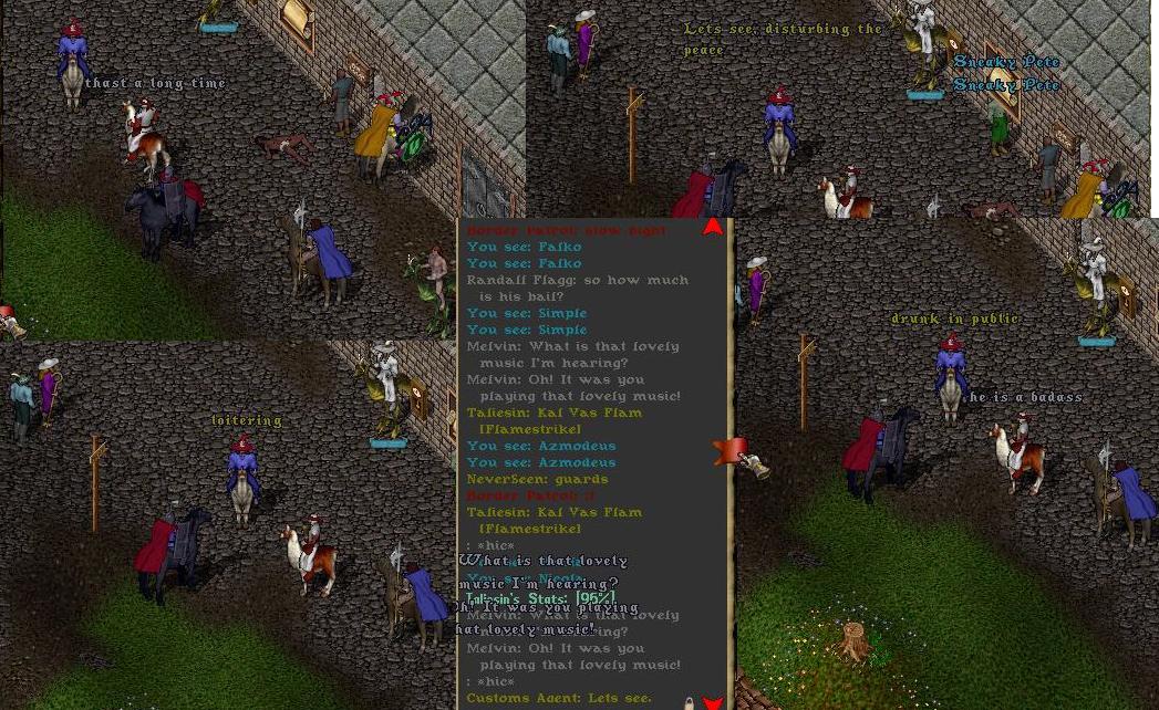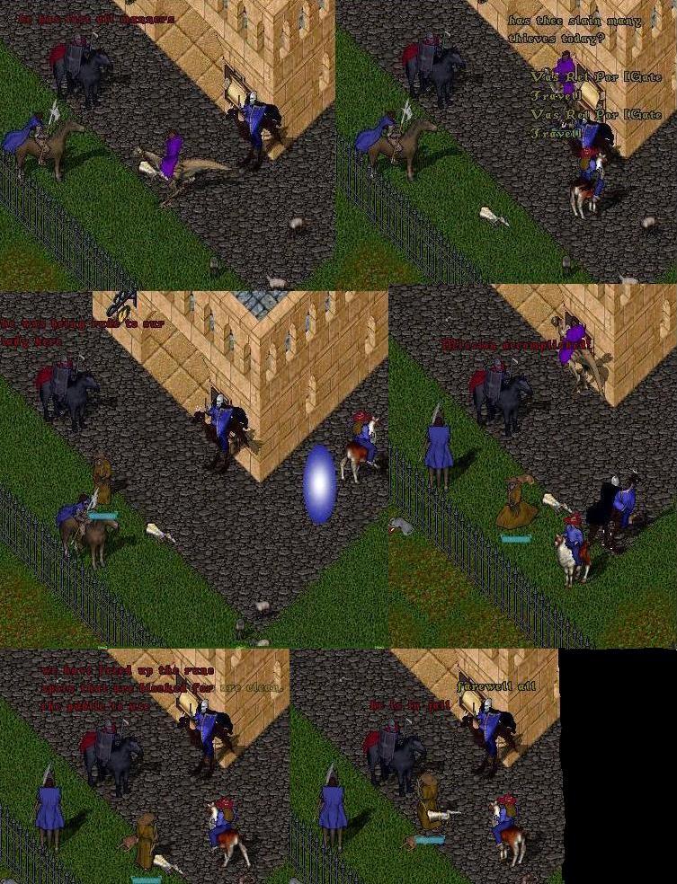 We had went to all of the towns in Sosaria, patrolled WBB a good while, and spent some time in front of BPD HQ making sure of his good well being while he was locked up. A total time of almost 3hrs real world time and 2 or 3 days UO time.
