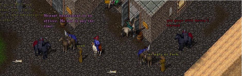 He then offers to hire us as his personal mining body guards. Captain Turbo informs him that public officials working under Lord British are not to be contracted out. He is upset by this and offers us sexual favors. I quickly respond letting him know that the BPD do not take sexual favors from anyone. He then turns his attention to cadet Shirley Colmes who is one of our female officers.