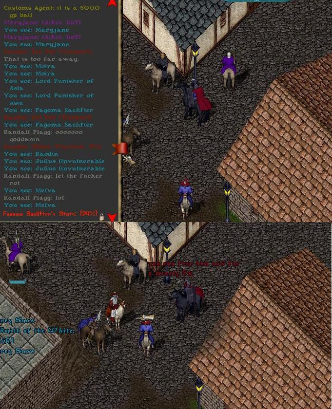 Randall Flagg (who used to be the Chief of Moonglow Police Dept.[link to story about the MPD] who is now GM of the Sunset Riders[link to story of most likely reason MPD was disbanded] ) runs up to us asking about who is going to free HIS miner. Upon hearing the length of time his miner would be incarcerated without bail he is flabbergasted.