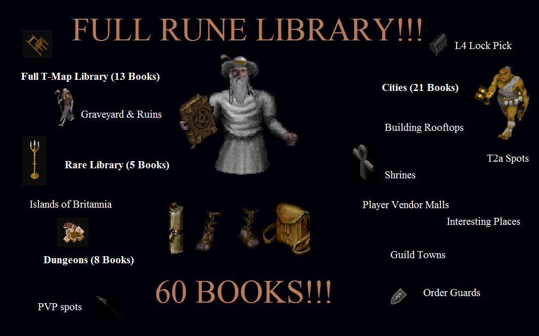 Today I start the bid for a real FULL RUNE LIBRARY. This library contains a total of 60 BOOKS! This is a high quality library and the LARGEST one I have seen. I have been selling full runebooks for around 6 months and have made a name for myself. Many of you have already purchased other runebooks from me and have been very pleased with the results. I always assure the highest quality in my product! So, please know this is not some cheap rune library. It contains practically everything you would want. This is a great way to promote your shop (since it is the largest), set up for your guild to use, or just store in your home for personal use. Either way, I am sure you will be very pleased with what you get. Details are below: