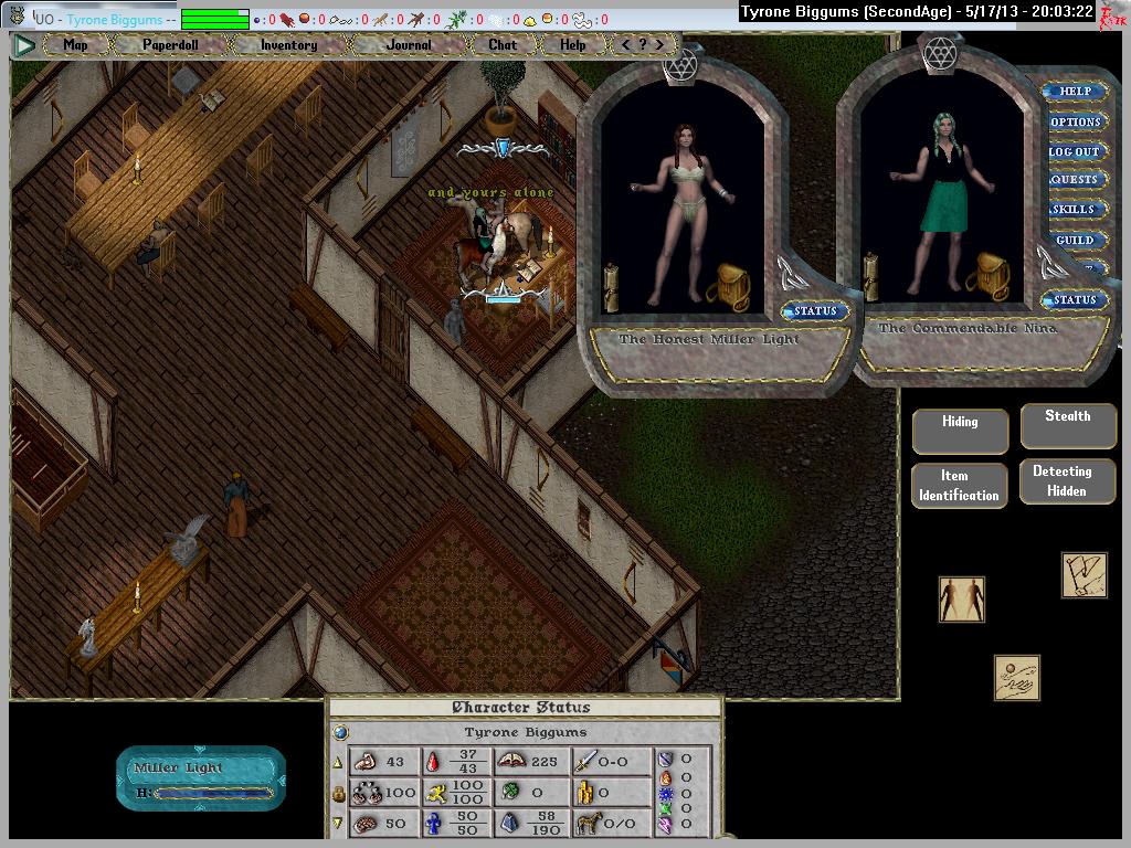 It all started one day when I woke up and realized I had smoked all of my rocks the night before, so I set out to try and score some more crack to smoke. From my experience I have found the best way is to sneak around and look at what people have and if I want it I take it. Sometimes I get away, sometimes I don't. This particular fine evening I found myself wandering around in the city of Skara Brae when I stumbled upon two fine ladies (Nina and Miller Light) in a secluded room. One of them was naked! I thought, they may be trying to hide something in there, maybe even some crack?? So I stealth my way in the room unnoticed and let me tell you what I saw: