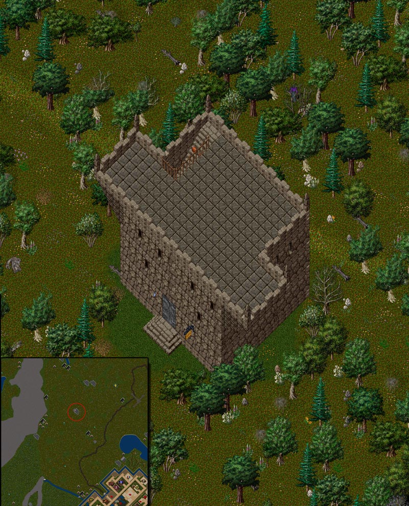 Selling this tower located north of Trinsic. Amazingly secluded (no neighbors for several screens), spawn is usually forest animals (deers, wolves), very rarely will you get aggressive spawn, and even then its usually just a single ratman or orc that wandered into the area.
